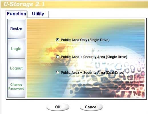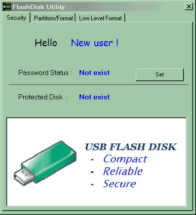 А вот прилагаемая к накопителю FlashDisk Utility — наоборот. Встречались мы уже с ней чуть больше полугода назад, когда тестировали большую кучу накопителей. Правда, тогда комплект состоял из двух утилит, ныне же все это и даже чуть больше умеет всего одна. Но первая закладка не изменилась вообще — здесь мы можем задать пароль для доступа ко всему накопителю или к его части (если он разбит на части).