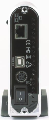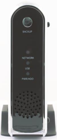 Устройство накопителя простое — пластиковая рамка, одна большая печатная плата с основными микросхемами, еще одна небольшая для лампочек и кнопки, вентилятор (3 см) для охлаждения диска. Все это убирается в крепкий алюминиевый корпус и выглядит достаточно строго. Корпус можно установить вертикально с использованием специальной рамки или расположить на столе горизонтально, для чего предусмотрены резиновые ножки. Рамка уже не имеет ножек, что не очень хорошо. Размеры корпуса компактные — 210×125×35 мм. На лицевой стороне корпуса расположены три индикатора (питание, USB, LAN), кнопка резервного копирования и решетка вентилятора. На задней панели находятся: USB и LAN порты, вход питания, выключатель и отверстия для вентиляции.