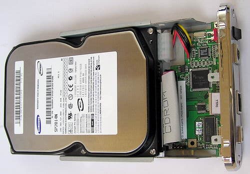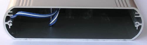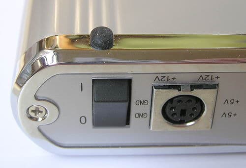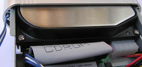 Открутив два винта, которые крепят заднюю панель разъемов к толстому литому алюминиевому корпусу, мы получаем доступ к внутренностям. Винчестер крепится 4 винтами к вставной люльке, которая на салазках вдвигается в корпус, причем между диском и корпусом образуется зазор, хотя какая-либо специальная амортизация диска в такой конструкции отсутствует.