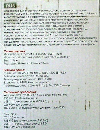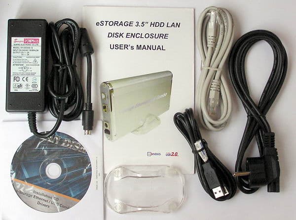 Внутри кроме собственно контейнера, упакованного между амортизаторами, находятся блок питания (разъём PS/2-подобный), два кабеля — USB и Ethernet, прозрачного пластика подставка для вертикального расположения устройства, краткое руководство пользователя на английском языке и CD с ПО и документацией (драйвера для USB под Win98 и драйвера NDAS от Ximeta и руководство пользователя к управляющему ПО от неё же).