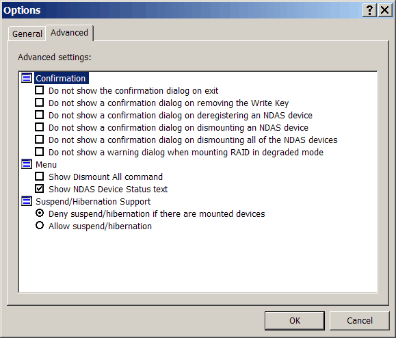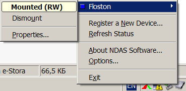 первая — NDAS Bind Management — служит для различных манипуляций с несколькими NDAS-устройствами (объединение в RAID 0/1/5 и т. д.), а вторая — NDAS Device Management — поселяется в системном трее и служит собственно главным центром управления диском. Возможности по управлению более чем прозрачно демонстрируют скриншоты.