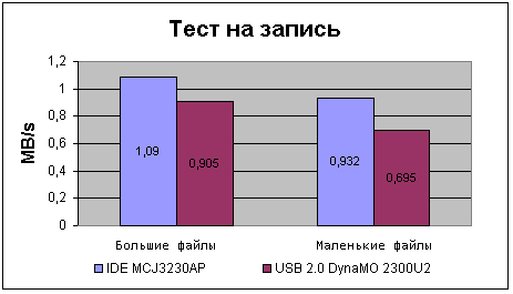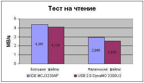 IDE привод достаточно уверенно обходит своего USB собрата. Любопытно то, что при работе с мелкими файлами разрыв в скорости записи значительно увеличивается. А сама скорость записи возросла примерно на 30% по сравнению с предыдущим поколением приводов GIGAMO 1.3. К сожалению, невысокая скорость записи, характерная для MO накопителей, не дает в полной мере почувствовать возможности шины USB 2.0, но у нас еще остался тест на чтение данных.