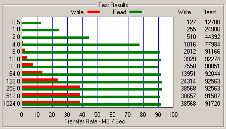 Другим показательным тестом «внутреннего устройства» дисков является тест на скорость чтения и записи файлов различного объема блоками разного размера — от 512 байт до 1 Мбайт. Для этого я традиционно использую тест ATTO Disk Benchmark. На скриншотах ниже показаны результаты для четырех размеров тестового файла — 128 (а также 256 и 512) Кбайт, 1 Мбайт, 4 Мбайт и 32 Мбайт. Если первый и второй, как правило, гарантированно кэшируются буфером диска (причем, кэширование записи и чтения для мегабайтного файла не так однозначно), то последний просто в него «не влезает», а кэширование предпоследнего зависит не только от объема буфера, но и от специфики работы firmware накопителя (кстати, результаты данного теста практически не зависят от выбора между FAT и NTFS).