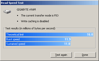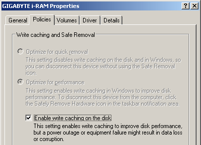 включая при этом «виндовое» кэширование записи (понятно, что встроенного буфера для кэширования данных, как в обычном винчестере, здесь быть не может, поскольку i-RAM фактически целиком сам является таким буфером :)).