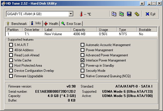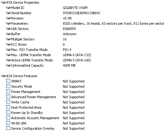Информация о RAM-диске Gigabyte, доступная через обычные диагностические утилиты, менее детальна, чем для винчестеров. Например, вот что можно узнать по утилите Everest Ultimate Edition: