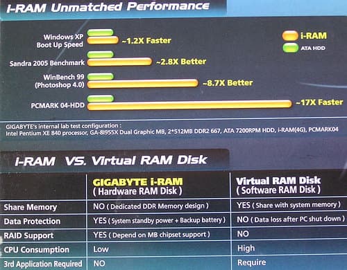 Среди отмеченных там же основных преимуществ i-RAM над традиционными виртуальными RAM-дисками, организованными программно в оперативной памяти компьютера, указаны: