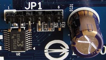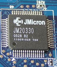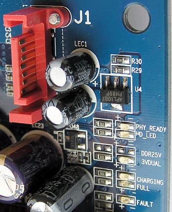Для организации интерфейса Serial ATA используется чип JM20330 от JMicron, который представляет собой транслятор ATA-интерфейсов из параллельного в последовательный (подобно тем, что устанавливались на ранние диски и контроллеры SATA). В принципе, данный чип поддерживает и скорость передачи данных 3 Гбит/с путем простого удвоения тактовой частоты. Но разработчики i-RAM, видимо, посчитали излишним использовать эту возможность. На плате предусмотрен и JTAG-порт (разъем JP1).