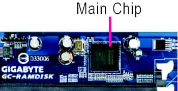 Сердцем i-RAM является контроллер памяти и PATA-интерфейса, расположенный в верхней части платы.