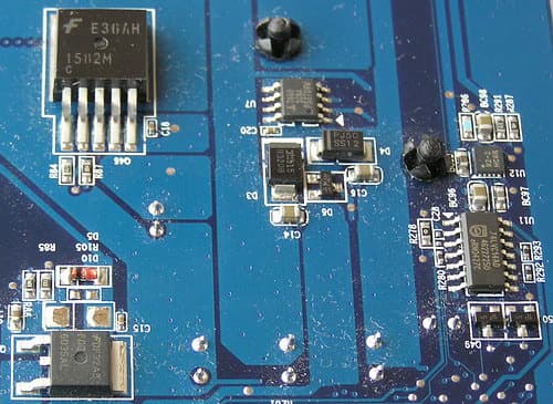 Плата имеет классический «гигабайтовский» синий цвет и использует 6 слоев металлизации. Честно говоря, шестислойный дизайн стоит поставить скорее в укор разработчикам, поскольку даже двухканальные DDR-слоты (на материнских платах) уже давно научились разводить четырьмя слоями, и для такой несложной, в общем-то, платы «шестислойка» является просто дополнительным источником дороговизны продукта (и облегчением жизни самим разработчикам) и вряд ли необходима технически. Впрочем, шины памяти на GC-RAMDISK разведены по всем правилам и в работе никаких нареканий/сбоев не вызывают.