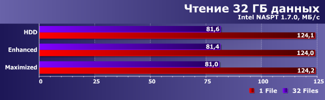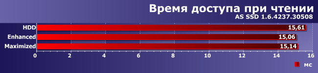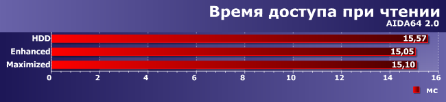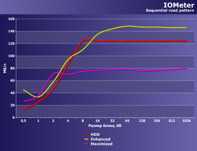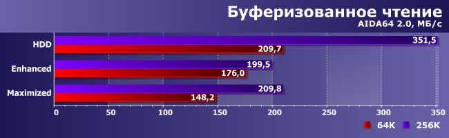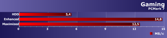 С определенного момента читать начинаем с SSD, а не с винчестера, а первый у нас пошустрее (хоть и не какая-нибудь модель «реактивной» производительности), так что все ускоряется. А вот в Maximized все плохо из-за усложненной логики: сначала драйвер проверяет, не были ли эти данные недавно записаны на SSD, а потом уже обращается к винчестеру, так что порцесс замедляется.