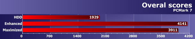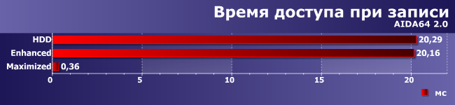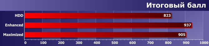 Запись практически ничего не дает Enhanced, поскольку данные все равно приходится записывать в файл на винчестере, зато если выбрать режим Maximized, получаем подтверждение рекламы Smart Response: ваш HDD будет работать как SSD! :) Такие результаты, естественно, тоже сказались на среднем балле, хотя, как видим, общий итог не такой уж и внушительный.