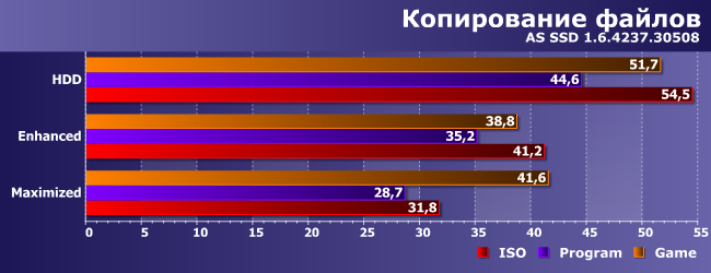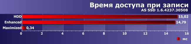 Здесь хорошо видно отличие режима Maximized ото всех остальных: записали на SSD, получили ответ о том, что операция выполнена успешно, и можно к следующим операциям переходить, а не ждать ответа именно от винчестера, что, как видим, требует в 50 раз больше времени.