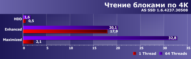 Все просто — тест работает с файлом размером 1 ГБ, который, естественно, мгновенно оказывается на SSD, так что в режиме Enhanced мы, практически, SSD и измерили. Maximized из-за своей специфики медленно работает с одним потоком чтения (накладные расходы сравнимы с основными), хотя даже тут «ускоряет» винчестер в 4 раза. Ну а на 64 потоках — во все 20 раз.