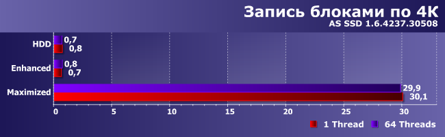 При записи картина обратная — тут уже режим Maximized способен немного увеличить производительность. Особенно на небольших блоках, что для SSD является более удобной операцией. А вот Enhanced лишь замедляет процесс: ведь нужно не только записать данные на винчестер, но и провести анализ, не стоит ли их сразу же и в кэш поместить.