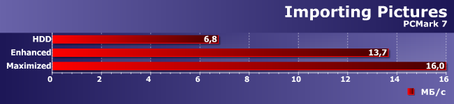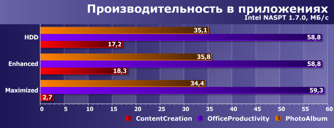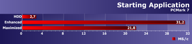 Приехали. Даже если не обращать внимание на то, что Maximized «завалил» работу на шаблоне ContentCreation (это-то легко поддается объяснению), остальные результаты оптимизма тоже не вызывают. Почему же так различается поведение PCMark7 и NASPT? А они работают по-разному. В PCMark7 есть семь записанных трасс, имеющих не такой уж большой суммарный объем. Причем прогоняются они по три раза, и первый — столь же медленный, как и при использовании винчестера. Однако ко второму все данные уже оказываются на SSD, так что тестируем мы по большей части именно его. Причем, заметим, три трассы все равно ускорить не удалось.