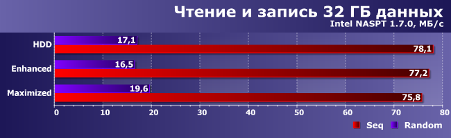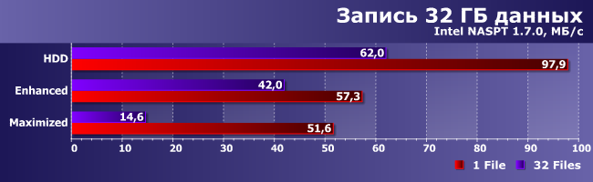 При записи данных Smart Response сильно замедляет работу. В максимальной степени — при использовании режима Maximized, что понятно: попытка реализовать отложенную запись 32 ГБ данных при помощи флэшки на те же 32 ГБ изначально обречена на провал. Ну а в режиме Enhanced этой проблемы нет, но есть другая: драйверу надо данные не только записывать, но и анализировать для последующего (возможного) использования. Так что неудивительно, что «прямая запись» оказывается самой быстрой — тут-то никаких сложностей нет.