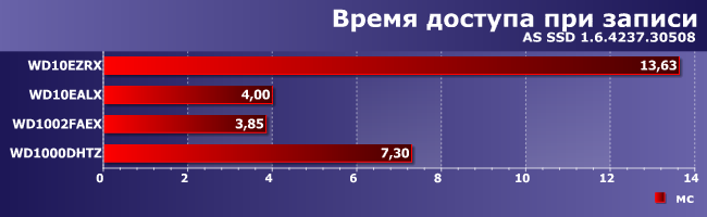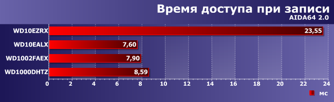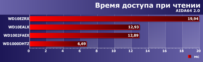 Как и следовало ожидать согласно времени доступа, на операциях чтения лучшим оказывается VelociRaptor, но вот при записи данных он не может «справиться» с винчестерами без Advanced Format. Аутсайдером является Green: тут и AF, и 5400 об/мин.