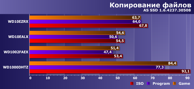 Копирование — без неожиданностей. И в очередной раз подтвердилось то, что производительность такого типа операций эффективнее (пусть и сложнее) повышать увеличением плотности записи, а частота вращения — обычный экстенсивный метод, позволяющий что-то «выжать» лишь при прочих равных.