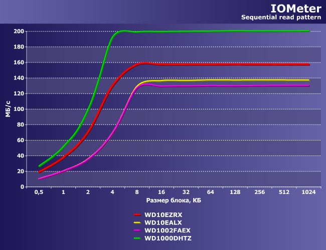 200 МБ/с — это много или мало? Лет пять назад мы бы охарактеризовали это результат как превосходный, года три назад он стал уже просто хорошим, а теперь — так себе. Впрочем, последняя оценка, конечно, является верной только если рассматривать рынок носителей информации в целом и благодаря бурному прогрессу в сегменте твердотельных накопителей. С другой стороны, и многие винчестеры более низкого класса уже подбираются к тем же значениям, но не благодаря скорости вращения, а из-за более высокой плотности записи. А она, что тоже хорошо видно по этим диаграммам, имеет крайне высокое значение — Green на линейных операциях с легкостью обгоняет Blue и Black. И, кстати, если вспомнить предыдущую статью, достигает тех же скоростей, что и Seagate Barracuda XT ST33000651AS. Что в этом такого? Все перечисленные диски имеют частоту вращения 7200 об/мин, а не 5400 об/мин, как WD10EZRX. Как ни крути (в буквальном смысле тоже), но терабайтные пластины — сила! :)