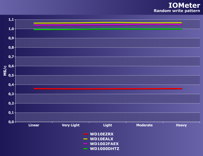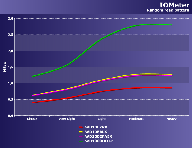 И самый сложный для винчестеров шаблон, где VelociRaptor по вполне понятным причинам разгромил всех остальных. В общем — вот она его стезя. Причем, отметим, за счет выровненных запросов, технология Advanced Format ни здесь, ни в предыдущем шаблоне не мешает. Да и вообще — победителем так и тянет объявить обновленный Green: победа десятитысячника тут была предопределена, а вот то, что энергоэффективная модель сможет обойти представителей предыдущего поколения, но более высокого класса, оказалось немного неожиданным.