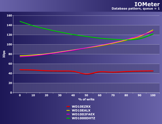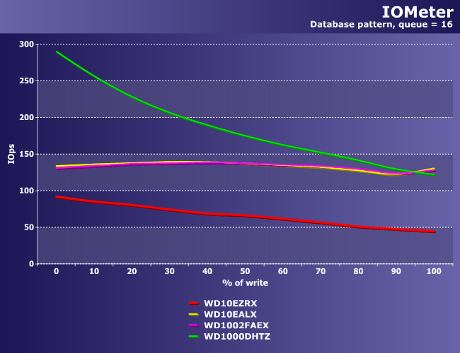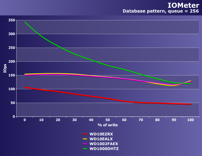 И закономерный итог в шаблонах баз данных — чем больше доля операций чтения, тем больше преимущество VelociRaptor, но по мере увеличения количества запросов на запись оно сходит на нет. В общем, набор характеристик винчестеров с появлением Advanced Format увеличился, что сделало картину более сложной — скорость вращения шпинделя дает преимущество лишь при прочих равных. С другой стороны, этот период был достаточно коротким — на данный момент подавляющее большинство жестких дисков уже перешло на пластины с AF, т. е. различий по этому пункту не осталось, и, следовательно, все опять возвращается на круги своя.