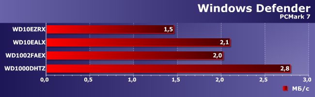В тестах SSD «Защитник Windows» вел себя на разных накопителях одинаково, а вот различия между винчестерами он замечает хорошо. Так что, как видим, альтернатив десятитысячникам с этой точки зрения нет.