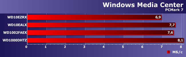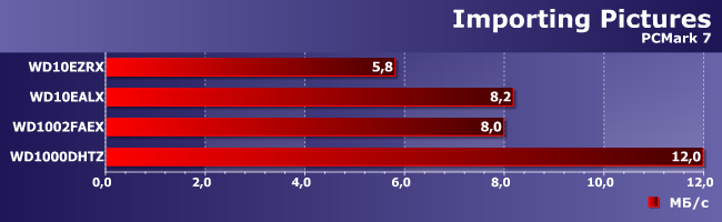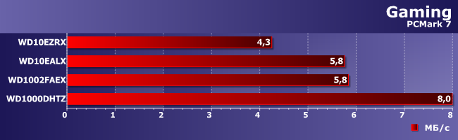 PCMark7 делит винчестеры на три группы, совпадающим с «житейской мудростью» образом: пропорционально частоте вращения. VelociRaptor примерно вдвое медленнее современных SSD, но это лучшее, что можно «выжать» из магнитной технологии: модели на 7200 об/мин он обходит на четверть, а «зеленые» модификации — более чем в полтора раза.