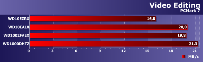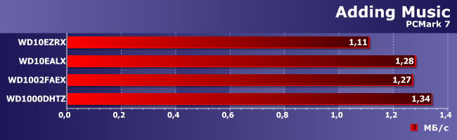 «Музыкальная» трасса видит больше различий между винчестерами, однако в основном они приходятся на сравнение Green vs. все остальные. В кои-то веки нам удалось задействовать в статье и ее результаты, на что мы уже, признаться, не рассчитывали: слишком низкие абсолютные показатели заставляют задуматься — а зависят ли они от накопителя вообще? Все SSD дружно и выдавали 1,4 МБ/с, но винчестеры, как видим, куда разнообразнее. Хотя и первоначальное предположение не так уж далеко от истины — по цифрам ясно, что это один из редких случаев, когда не только VelociRaptor, но и «обычные» винчестеры лишь незначительно отстают от твердотельных накопителей.