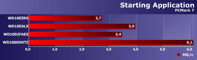 Зато по скорости запуска приложений отставание на порядок, но если рассматривать только механические накопители, то VelociRaptor, бесспорно, по-прежнему хорош: обгоняет что массовые, что, тем более, энергоэффективные серии в полтора-два раза. Кстати, и среди последних разброс не мал, что уже становится привычным. А удивило нас лишь то, что более «статусный» Black отстал от «народного» Blue, несмотря на близость ТТХ. Не в первый раз уже, но на этот раз — очень заметно.