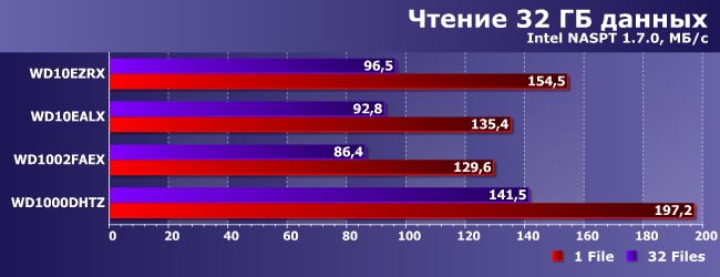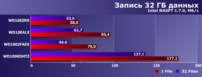 Интересным оказывается не то, что VelociRaptor быстрее остальных (это априори было очевидно), а то, что при одновременной работе с 32 файлами он оказывается практически столь же быстр, что и прочие винчестеры в «чисто последовательном» режиме.
