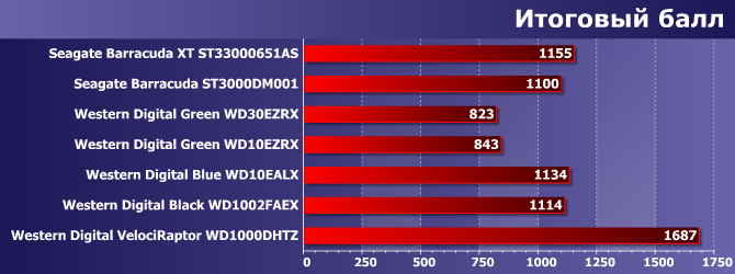 Многословных комментариев не требуется — как видим, проделав кучу тестов, мы пришли к тому же, что на бытовом уровне утверждает житейская мудрость: винчестеры можно группировать по скорости вращения шпинделя. Другие технические характеристики, безусловно, тоже сказываются, однако уже в меньшей степени: разброс внутри группы процентов так 20 (если, конечно, не брать совсем уж старые модели). При этом семитысячники обходят «зеленые» накопители не менее, чем на 25%, а топовые высокооборотистые модели возвышаются уже над ними на все 50%.