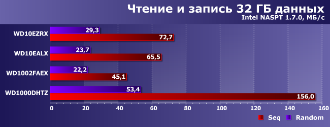 Неожиданно? Для нас тоже. Но если немного подумать, то все становится понятно: Blue и Black у нас были относительно «старыми», т. е. без поддержки Advanced Format, а вот VelociRaptor — с оной. И закономерный результат — он должен был быть в пару раз быстрее, а оказался даже чуть более медленным. Впрочем, в более новых моделях семитысячников эта «несправедливость» уже устранена: они тоже используют Advanced Format, так что подобных рекордов не ставят, а, как и положено, отстают от VelociRaptor в два-три раза. Но только потому, что сами стали более медленными.