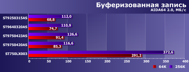 С записью интереснее. Судя по всему, гибридная технология внутри винчестера режет однопоточную скорость так же, как это делает и Smart Response, а вот с 32 потоками ST750LX003 управился лучше всех, даже обогнав намного ST9750420AS. «Классические» же винчестеры никаких сюрпризов не преподнесли.