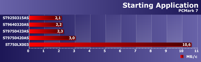 Тот самый случай, когда гибридный винчестер должен был отыграться за все неудачи. И, разумеется, отыгрался, обогнав по результату PCMark7 даже VelociRaptor новейшей линейки. А вот показатели остальных моделей низкие. Причем особенно любопытным образом выглядит ползучий прогресс в семействе Momentus 5400: нельзя сказать, что его там нет совсем, однако емкость вот увеличилась в три раза (среди участников сегодняшнего тестирования, разумеется), а по производительности и 7% не набралось.