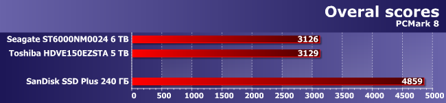 Мы воспользовались «совместимостью» тестовой методики для разных типов накопителей и сразу же получили практически важный результат :) Как не раз уже было упомянуто, баллы «верхнего уровня» в PCMark 8 (да и PCMark 7 отчасти) обычно не позволяют увидеть сколько-нибудь заметную разницу между твердотельными накопителями. А вот если сравнить SSD (пусть даже медленные) с винчестерами (пусть даже быстрыми) — получим полуторакратный разрыв в производительности. Такую разницу можно заметить не только в тестах, но и «невооруженным глазом». И именно она дает неоднократно описанный эффект: после установки SSD все начало летать.