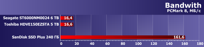 Впрочем, понятно, что настолько «зрелые» продукты, как накопители на жестких дисках «стационарного» форм-фактора, совсем не относятся к устройствам, позволяющим получить большую разницу в производительности. При использовании разных технологий она, разумеется, будет, но все равно не принципиальная, а накопители одного класса и времени выпуска независимо от производителя будут иметь примерно равные характеристики. Собственно, именно поэтому покупатели в большей степени обращают внимание именно на торговую марку («не хочу это — не нравятся они мне» или наоборот), цену и условия гарантийного обслуживания. Но все перечисленные особенности меняются в зависимости от географического положения покупателя и его пристрастий, и лишь надежность могла бы стать универсальным определяющим фактором. Однако единственный способ получения данной информации — статистический, а исчерпывающую статистику по какой-либо модели получается собрать лишь через несколько лет после того, как она оказывается снятой с производства и исчезает из продажи. Поэтому на практике мы можем исследовать только демонстрируемый накопителем уровень производительности. А чтобы делать это было не слишком скучно, в части тестов мы сравним Х300 не только с аналогичным винчестером Seagate Enterprise Capacity HDD v4 на 6 ТБ, но и с бюджетным твердотельным накопителем SanDisk SSD Plus 240 ГБ. Ведь мы регулярно повторяем, что любой SSD подойдет для ускорения работы системы, если заменить им винчестер, но крайне редко сравниваем устройства этих групп напрямую. А сегодня сделаем это.