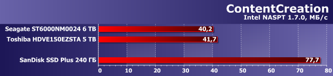 NASPT демонстрирует ту же картину: не разный порядок, но почти двукратное отставание винчестеров от бюджетного SSD. А наполовину полон стакан или наполовину пуст — каждый покупатель должен выбрать для себя сам. Это уже субъективные оценки вполне объективного расклада.