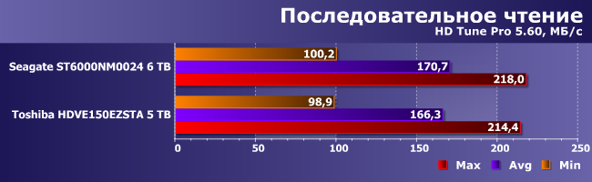 Одинаковые по плотности пластины одинакового диаметра, вращающиеся с одинаковой скоростью, неизбежно дают практически идентичный результат: порядка 220 МБ/с на внешних дорожках и лишь в районе 100 МБ/с на более коротких внутренних. Как видите, если твердотельные накопители уже «уперлись» в ограничения SATA600, то винчестерам все еще более чем достаточно SATA300.