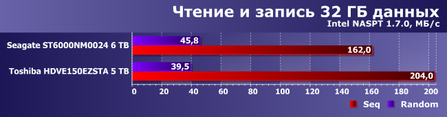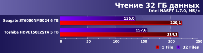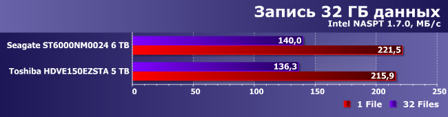 «Однопоточный» режим хорошо коррелирует с тестами низкого уровня, а вот работа с 32 файлами (пусть даже близко расположенными) винчестер замедляет. Причем в данном случае накопитель Toshiba уже заметно опережает представителя ассортимента Seagate.