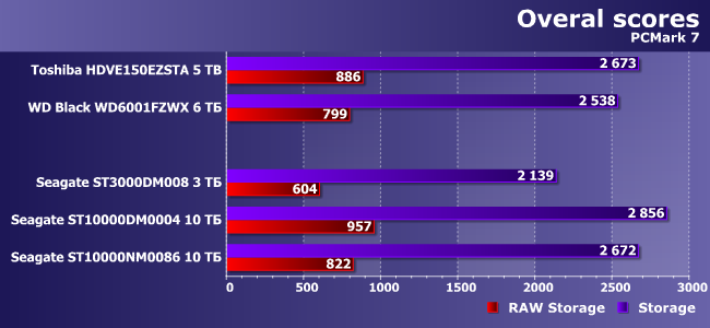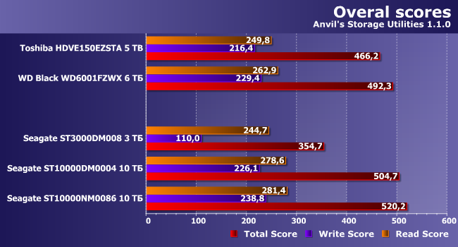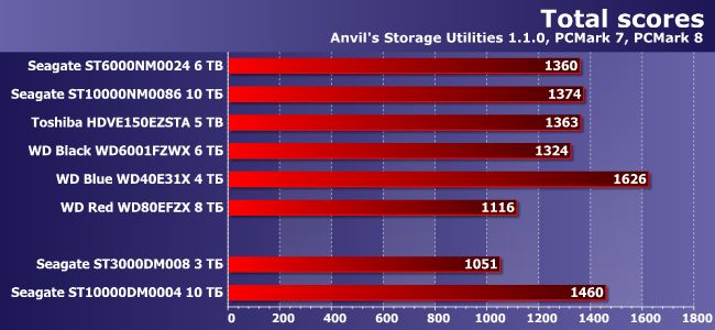 Понятно, что на роль «основного и единственного» накопителя в системе может претендовать разве что младшая BarraCuda (да и то ограничено — как уже было сказано выше, экономные пользователи обходятся «терабайтниками» и не обязательно новыми, а прочие добавляют к системе бюджетный или не очень SSD), но никак не винчестеры на 5+ ТБ, что делает результаты высокоуровневых тестов синтетичными. С другой стороны, низкоуровневые — по-определению такие всегда, так что рассмотреть еще один сценарий (некогда — очень типичный) небесполезно. Но и не слишком интересно. Внимание вызывает разве что отставание «тритера» от всех участников тестирования (даже накопителей WD и Toshiba на аналогичных пластинах), а также небольшой выигрыш «десятки» не только у упомянутых, но и у ближайшего родственника. Как видим, идентичность ТТХ не всегда приводит к идентичности производительности — современные винчестеры являются уже настолько сложными устройствами, что та или иная оптимизация прошивок может иметь значение.