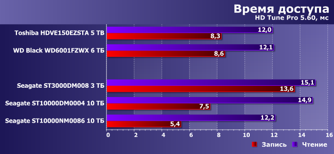 А время доступа дает намек на то, почему BarraCuda на 3 ТБ в тестах высокого уровня оказалась явным аутсайдером — задержки максимальные; особенно при записи. С другой стороны, BarraCuda Pro тоже не лидер, а Enterprise Capacity низкая латентность никак не помогает. Это как раз то, о чем мы предупреждали выше — современные винчестеры стали настолько сложными, что по одним лишь тестам низкого уровня уже невозможно предугадать: как они будут вести себя в сложных сценариях. Значение имеют уже и электроника, и даже прошивки — иногда определяющее. С другой стороны, принципиально положение дел они все равно не меняют: который год все винчестеры одного класса и по производительности выглядят сходным образом.