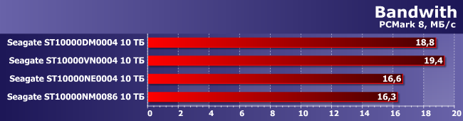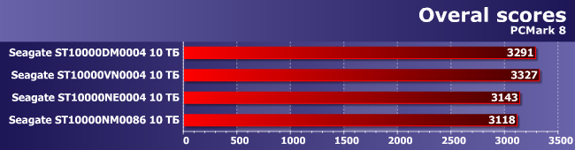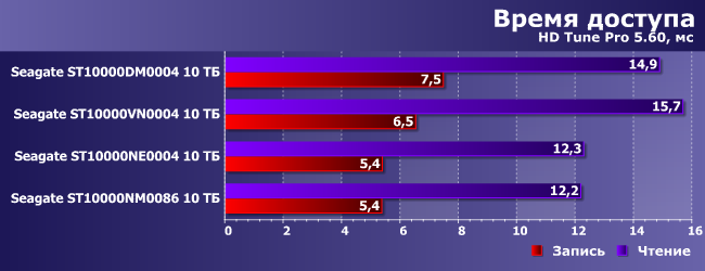 Понятно, что для ориентированных на NAS дисков это вообще не целевое назначение, однако относительно сложные нагрузки как раз и позволяют поискать различия между моделями. Которые, вообще говоря, есть, но, скорее, не между моделями, а парами таковых. В одну группу попадают условно-персональные BarraCuda Pro и IronWolf (что забавно, второй еще и немного быстрее), в другую — корпоративные IronWolf Pro и Enterprise Capacity.