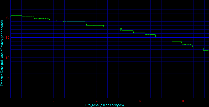 Здесь уже размер буфера особой роли не играет, поэтому лидерство Quantum вполне закономерно. Я довольно долго думал, чем объяснить такую разницу в результатах однотипных моделей от WD. Потом взглянул еще раз на график, и, кажется, понял. При малых размерах блока присутствие таких провалов в скорости чтения, как у WDC AC418000, может существенно повлиять на результат, что, по-видимому, и произошло. Отсюда же, видимо, и повышенная загрузка процессора.