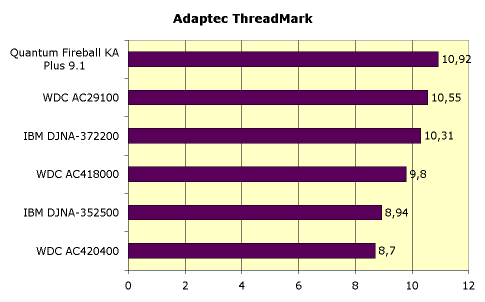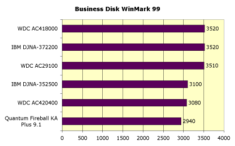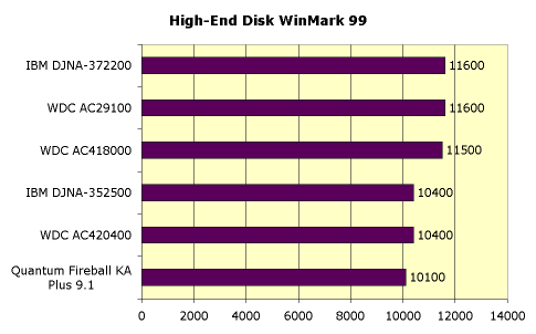 Модель Quantum Fireball KA Plus — первый опыт компании в производстве жестких дисков с интерфейсом IDE и частотой вращения шпинделя 7200 об/мин. Серия состоит из четырех моделей — емкостью 6.4, 9.1, 13,6 и 18,2 ГБ. К сожалению, в Москве (и то в последний момент) удалось найти только модель емкостью 9,1 ГБ, что вынудило нас немного отойти от предполагавшейся методики — тестировать старшие модели серий. Поскольку у IBM в серии DJNA вообще нет моделей сравнимой емкости, пришлось расширить линейку тестируемых моделей WD.