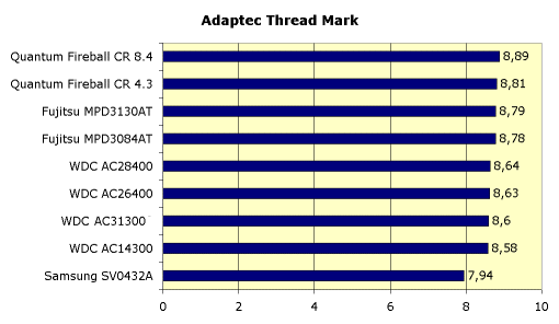 Adaptec ThreadMark. Как всегда, в первой колонке приведено средневзвешенное значение скорости обмена в МВ/сек по результатам 64 тестов, в процессе которых проводятся операции чтения и записи блоками по 512 байт, 1, 2, 4, 8, 16, 32 и 64 килобайт одной, двумя, тремя или четырьмя цепочками (thread) одновременно, с использованием стандартных вызовов Win32 API. Во второй колонке — загрузка процессора во время выполнения тестов.