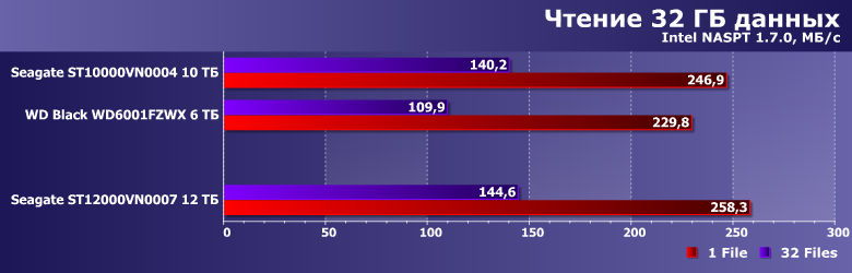 В этом году Seagate начала поставки винчестеров на 12 ТБ — сначала на корпоративный рынок, а теперь уже и на массовый. Что изменилось в новых топах семейств BarraCuda Pro, IronWolf и IronWolf Pro? Радикально — ничего; просто доработка технологии позволила компании установить в один корпус уже не семь, а восемь пластин. Естественно, не обошлось и без «побочных» улучшений — в частности, по заявлениям производителя, уменьшилось энергопотребление. Но в целом это эволюционное, а не революционное усовершенствование: речь по-прежнему идет о накопителях со скоростью вращения шпинделя 7200 об/мин, 256 МБ кэш-памяти, интерфейсе SATA600 и т. п. Несложно заметить, что и плотность записи осталась примерно той же — просто за счет дополнительной пластины общая емкость выросла на 20%. «В терабайтах», однако, увеличение звучит внушительнее — все-таки огромное количество компьютеров и сейчас продается с винчестером на 1 или 2 ТБ, а в ноутбуках встречаются и меньшие значения. Не говоря уже о твердотельных накопителях, емкость ходовых модификаций которых в основном все еще измеряется сотнями гигабайт. Здесь же прирост с 10 до 12 ТБ. Или, например, увеличение емкости массива RAID5 в четырехдисковом NAS с 30 до 36 ТБ. Звучит внушительно :) И до активных продаж винчестеров с HAMR-головками, которые сразу же начнут использовать пластины по 2 ТБ (по нынешним прогнозам), так что восьмидисковый пакет позволит вместить в корпус уже 16 ТБ, это значение вряд ли увеличится. При этом цены HAMR-дисков первое время будут заметно более высокими, чем у «классических» винчестеров, так что за пределы ЦОД они вряд ли быстро выйдут. В общем, стоит готовиться к тому, что в массовом сегменте 12 ТБ — это всерьез и довольно надолго. Впрочем, об истинной массовости здесь, конечно, говорить трудно: цены таких накопителей низкими тоже не назовешь. В частности, рекомендованная цена 12-терабайтных BarraCuda Pro и IronWolf Pro составляет внушительные $540. Цена обычного IronWolf несколько более гуманная — «всего» $470, но не стоит забывать о том, что диски этого семейства имеют трехлетний, а не пятилетний срок гарантии. В московской рознице новый IronWolf стоит порядка 30 тысяч рублей, тогда как «старый маленький» на 10 ТБ обойдется владельцу примерно в 24 тысячи рублей (а можно найти и более дешевые предложения). В общем, пока цена гигабайта (или уже терабайта, скорее) сопоставимая — да и сложно было бы ожидать обратного :) Но если стоит задача получить максимум от каждого дискового отсека — выбирать не приходится: эти 20% придутся очень к месту. А как они в первом приближении работают, мы сегодня оценим.