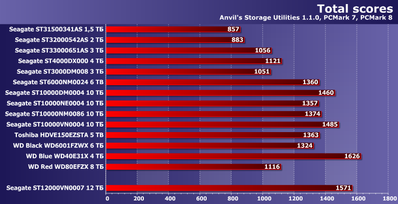 Баллы этой программы — практически оценка скорости выполнения низкоуровневых операций в чистом виде. Некоторые из этих операций удобны для винчестеров, но основная масса — нет, так что в итоге получается лишь порядка пяти сотен баллов на фоне выдаваемых даже бюджетными SSD двух тысяч с лишним. Опять же, на открытие это не тянет: так было, есть и будет всегда.