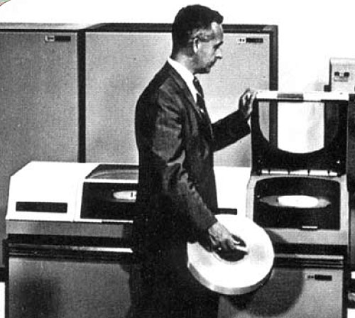 Итак, первый винчестер оказался на 2 года старше первой микросхемы! (Кстати, готовьтесь — ровно через 2 года, 12 сентября 2008 индустрия будет отмечать полувековой юбилей микросхем. ;)) Что представлял собой первый накопитель на магнитных дисках? В отличие от маленькой микросхемы (кристалла, который и тогда, в 1958 году умещался на одном пальце) первый жесткий диск был огромным шкафом, в котором находился пакет из 50 большущих пластин диаметром 24 дюйма (более 60 см) каждая.