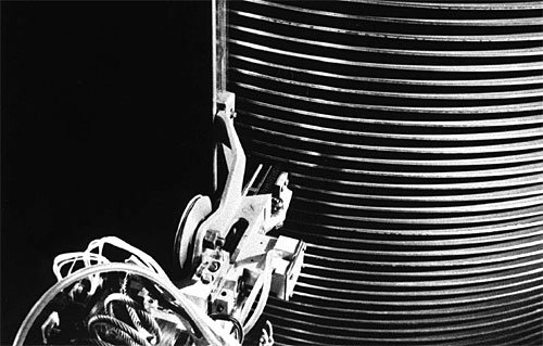Информационная емкость этого гиганта составляла 5 Мбайт (5 млн. байт), что по нынешним понятиям кажется смешной цифрой, но тогда это был High-End сегмента Enterprise. ;) Пластины были смонтированы на вращающемся шпинделе, а механический кронштейн (один!) содержал головки чтения и записи и перемещался вверх-вниз на вертикальном стержне, причем время доставки головки до нужной магнитной дорожки составляло менее одной секунды.