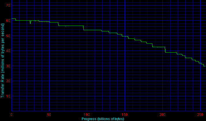 Вывод один — для моделей емкостью 160 Гбайт серии T7K250 Hitachi использует иное форматирование пластин, нежели для старшей модели этой же серии. Впрочем, необходимо также отметить, что данные накопители (вслед за Deskstar 7K80 и многочисленными Travelstar) применяют так называемое адаптивное форматирование, что при определенных условиях видно на графиках скорости линейного чтения в высоком разрешении (см. ниже).